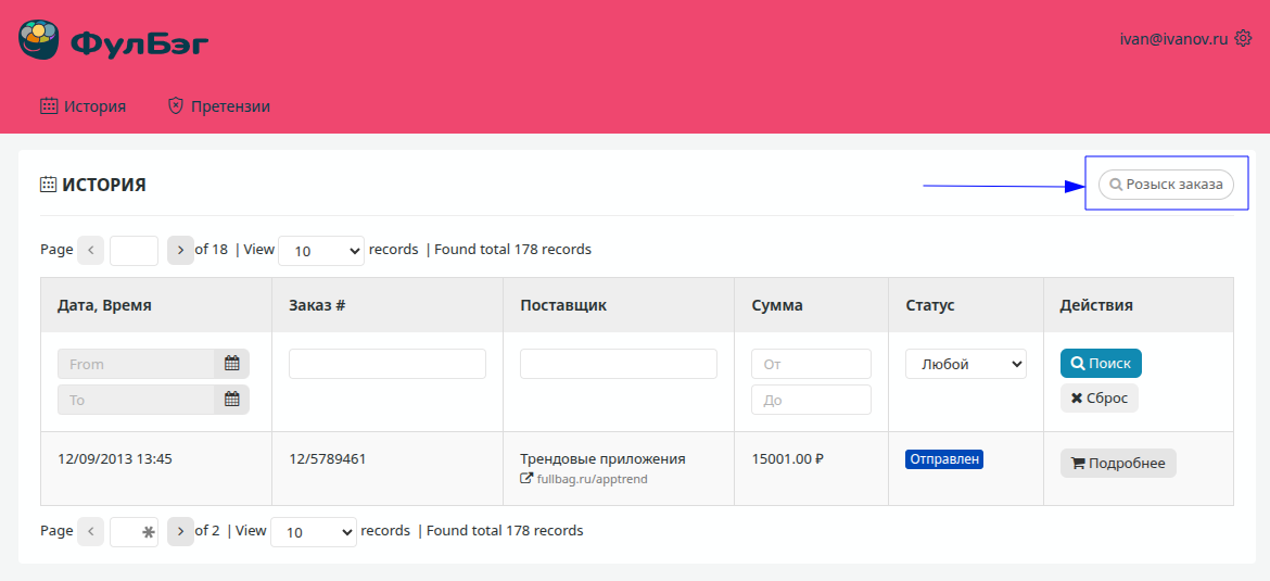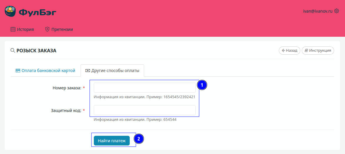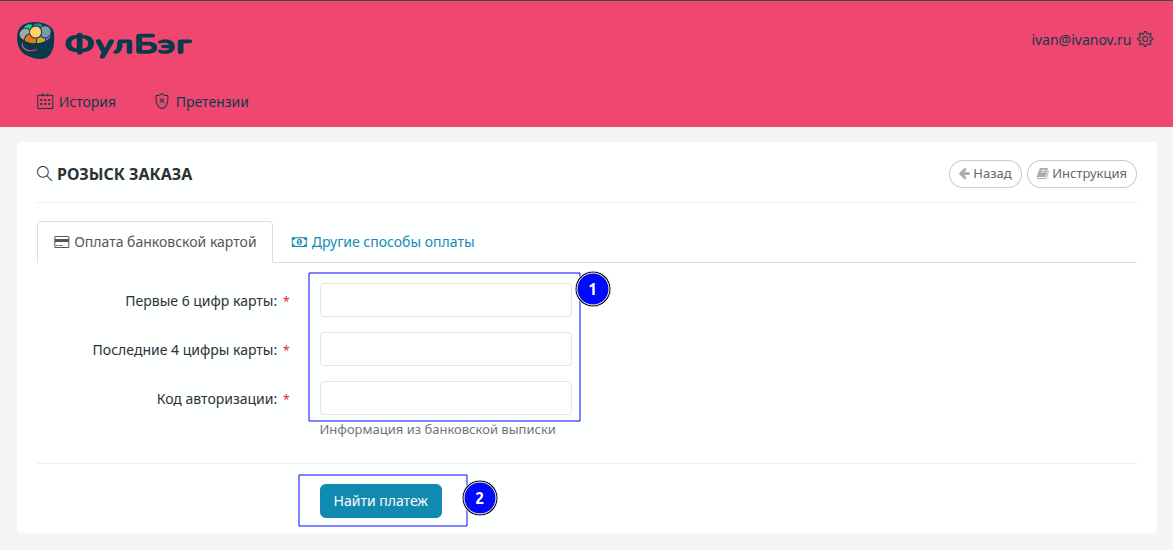 В ФулБэг большинство покупок можно совершить без регистрации, но в некоторых случаях для блокировки платежа, отслеживания истории покупок или подачи претензии поставщику могут понадобиться данные о платеже. Поиск платежа осуществляется на основе информации, указанной в комментарии к платежу, будь то оплата через платежную систему, банковский перевод или оплата через терминал, либо данные из банковской выписки, если оплата была произведена банковской картой.