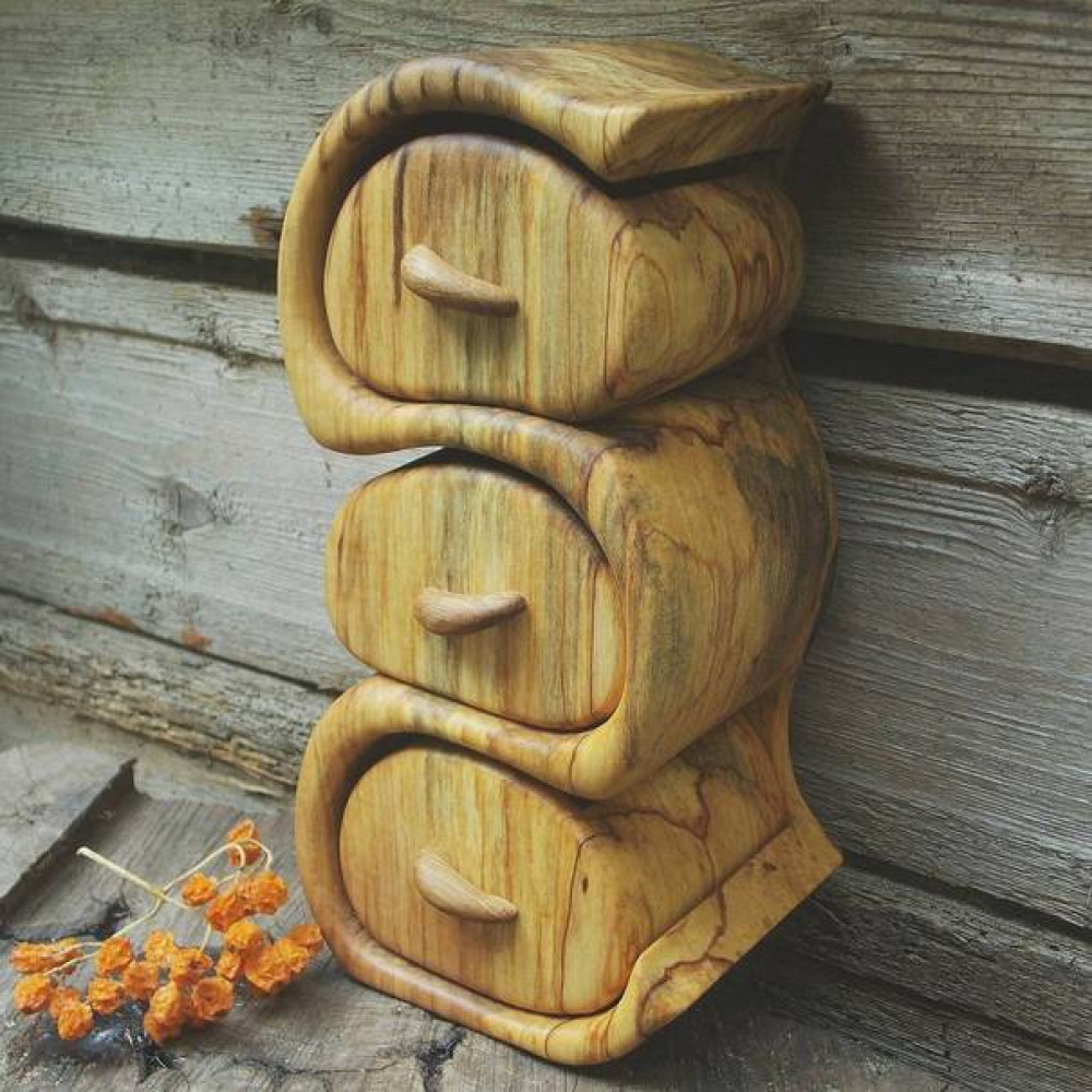Шкатулка из клена, выполненная из одного куска дерева. Грибница, проникшая в волокна древесины, создает неповторимый рисунок. Пропитанное льняным маслом, дерево играет оттенками теплых тонов и создает ощущение бархатистости и мягкости. Ручки, выполненные из дуба, подчеркивают асимметрию форм и общую консцепцию изделия