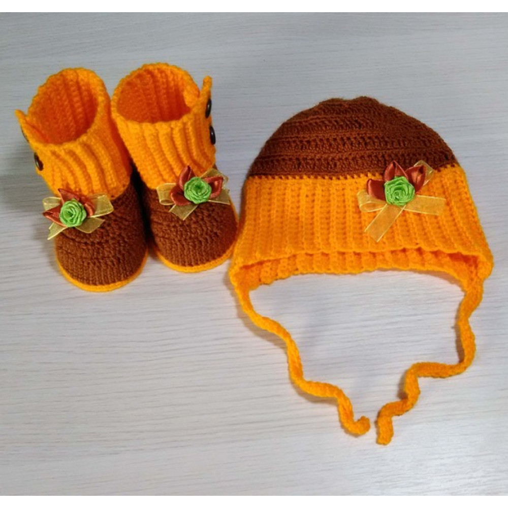 Комплект для самых маленьких, выполнен из детской гипоаллергенной пряжи, мягкий, легкий, красивый.Шапочка на объем головы 35-40 см, имеет ушки и завязочки, а также удлинена сзади.Пинетки ботиночки - это практичная модель, удобные, легкие, застегиваются на две пуговички.Цвет комплекта золотисто-коричневый с оранжевым. Очень красивое сочетание цветов. Комплект украшен розочкой и бантиком из атласной ленты ручной работы, что придает комплекту дополнительной изящности.Комплект послужит хорошим подарком на рождение малыша, а также идеально подойдет на выписку из роддома, и фотосессии.Хочу обратить Ваше внимание, что цветопередача на разных устройствах разная и цвет незначительно может отличаться.