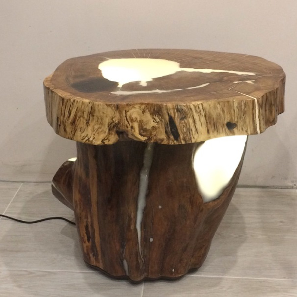 Столик сделан из спила дуба и пенька яблони, залит смолой молочного цвета. С подсветкой. Этот столик продан, сделаю на заказ.