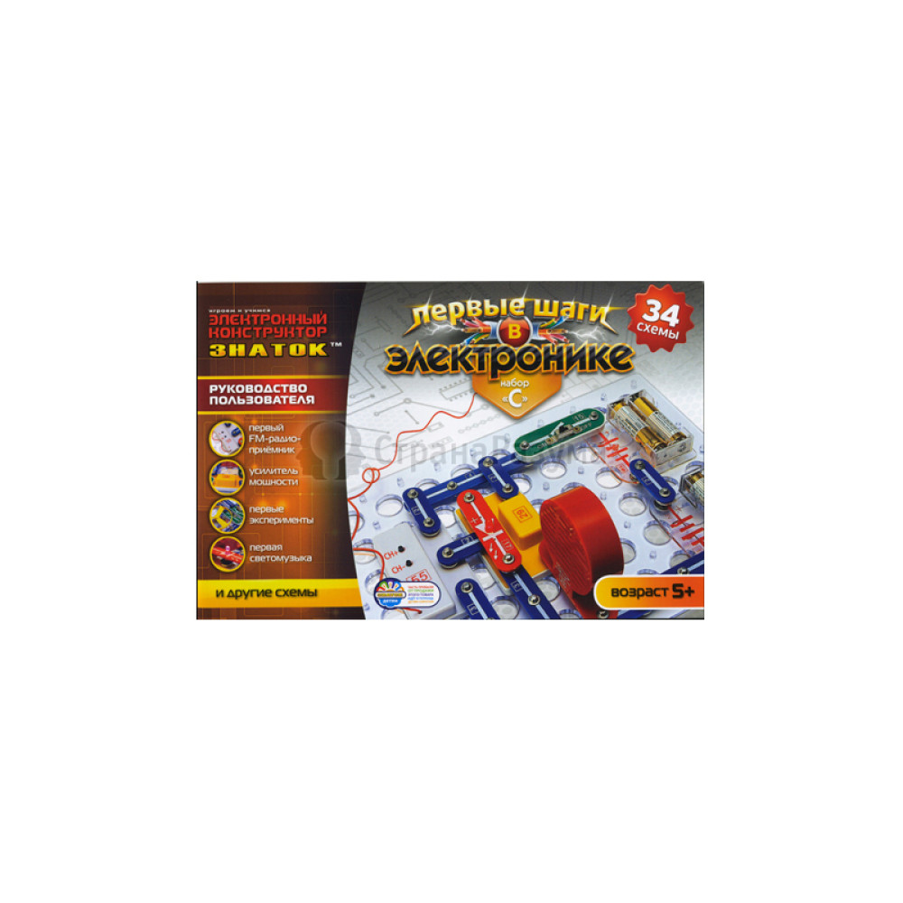 Электронный конструктор Знаток «Первые шаги в электронике» (34 схем, набор С), поможет ребенку получить первые базовые знания в отрасли электроники, научиться читать электронные схемы и собирать простейшие приборы.