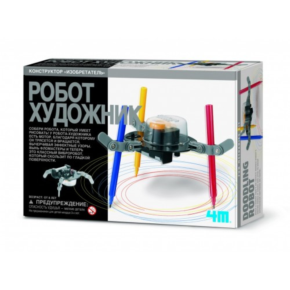 Сенсация в мире техники! Появился робот, который умеет рисовать картины. А главное, его можно собрать своими руками с помощью увлекательного набора от 4М. Готовы к неожиданным открытиям? Тогда вооружитесь отверткой и принимайтесь за дело! Инструкция, прилагаемая к набору, подробно расскажет, как сконструировать гениального робота-художника всего за несколько минут. Украсьте его картинами всю комнату и расскажите гостям, что эти шедевры создал ваш личный робот. Секрет его гениальности прост. Внутри робота ��асположен мотор, который создает вибрацию и заставляет всю конструкцию вращаться и подпрыгивать. Если фломастеры вынуть из держателей, то робот будет просто скользить по поверхности. Наблюдая, как самодельный художник вычерчивает узоры на бумаге, ребенок проникнется интересом к роботехнике и механике. Наверняка он захочет узнать больше о разных устройствах и принципах их действия. Стимулируйте эту любознательность научно-познавательными наборами от 4М. В комплекте 1 грузик Болты и гайки, винты 2 колпачка-зажима 1 основание 3 кронштейна Держатели для фломастеров 3 ножки Клейкая лента 1 прозрачная крышка 3 фломастера 1 мотор с проводами 1 крышка мотора Детальная инструкция на русском языке Требуется одна батарейка АА, в комплект не входит. Как рисует робот-художник? Мотор робота питается от батареек. Полученную энергию он преобразует во вращательное движение грузика. Центр тяжести грузика смещен в сторону относительно оси мотора. Из-за этого вращение вызывает вибрацию и заставляет робота подпрыгивать. Когда фломастеры отрываются от бумаги, циклические вибрации поворачивают их по кругу. Без подпрыгивания фломастеры не смогли бы преодолеть силу трения и двигаться дальше. Описанный механизм самый простой из существующих. Сегодня есть роботы, которые могут резать бумагу, выводить сложные геометрические фигуры и даже рисовать портреты. Об этих и других чудесах науки расскажет роботехника. Меры предосторожности Набор предназначен для детей старше 8 лет. Перед началом сборки внимательно прочтите инструкцию. Помните, что при работе с конструктором требуется контроль взрослых. Игрушка предусматривает наличие мелких деталей, поэтому не рекомендуется детям младше 3 лет. Для наилучших результатов используйте новые батарейки. И никогда не смешивайте новые элементы питания с израсходованными. Вынимайте батарейки, когда не пользуетесь игрушкой. Не прикасайтесь к контактам батарейного отсека металлическими предметами, чтобы не спровоцировать короткое замыкание.