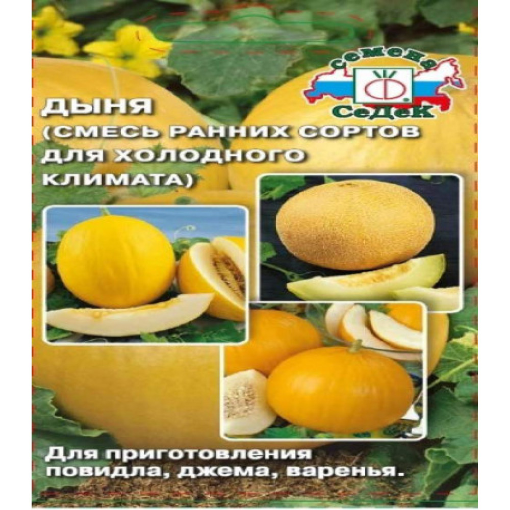 Смесь сортов дыни с коротким периодом вегетации - раннеспелых (б5-70 дней) и среднеранних (75-80 дней). Растения компактные.